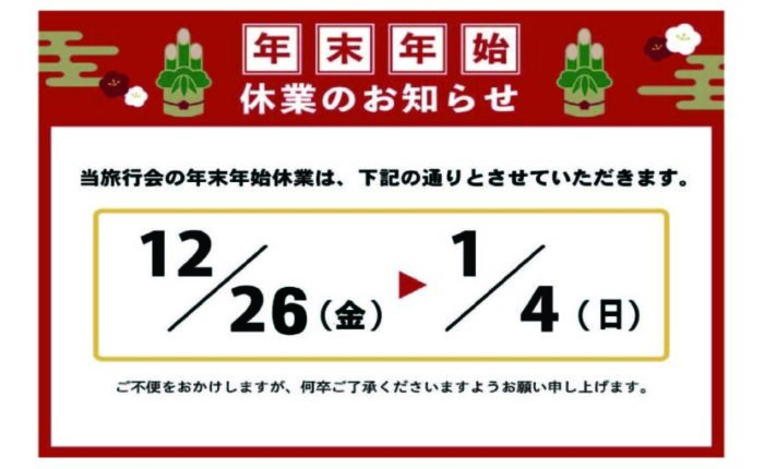 さて、当旅行会の年末年始の休業は、下記のとおりとさせていただきますので、よろしくお願い申し上げます。